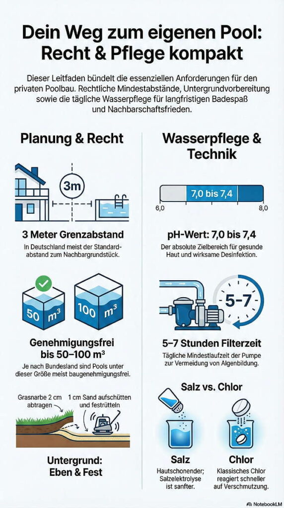 Wichtig ist außerdem, einen finanziellen Puffer einzuplanen. Preissteigerungen bei Baumaterialien, unerwartete Bodenverhältnisse oder zusätzliche Wünsche wie Beleuchtung oder Gegenstromanlage können das Budget schnell um 10 bis 20 Prozent erhöhen.
